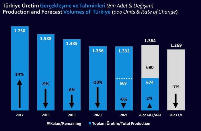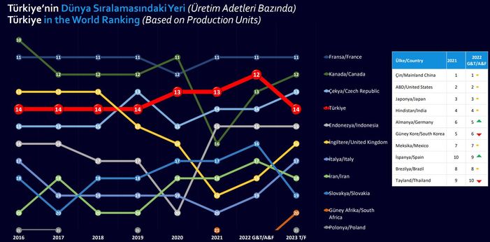 Dünyada otomotiv talebinin düşmeye başladığına işaret eden Saydam, “Önümüzdeki dönemin çok önemli gündem maddesi talep olacak. Çünkü şu ana kadar hep arzda sorun vardı. Ülkemiz 2021’e göre dünyadaki araç üretimi açısından bir sıra 2022’de yükselmiş durumda. Ukrayna krizi nedeniyle Rusya’daki otomotiv üretiminin neredeyse durma noktasına gelmesi, Rusya’ya basamak kaybettirdi. Türkiye otomotiv üretiminde bu seneyi bir sıra yukarıya çıkarak tamamlayacak. 2023 için ise uluslararası çevrelerde Türkiye’nin 2 basamak gerileyeceği varsayılmakta” bilgisini paylaştı.