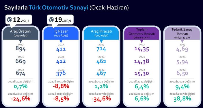Yıllar içinde ihraç edilen araç fiyatlarının arttığına da değinen Saydam, “2017’de Türkiye’nin ihraç ettiği araçların birim fiyatı 13 bin 500 dolardayken, şu anda 18 bin 850 dolar. Bu araçların girdilerinde olan artışların kısmen fiyatlara yedirilmesi, ama en önemlisi araç yapısı anlamında katma değeri ve teknolojisi daha yüksek araçlar ürettiğimizden ve ihraç ettiğimizden dolayı birim fiyatta bir artış var. 2017’yi referans olarak almamızın nedeni 2017 üretim, iç pazar ve ihracat açısından rekor bir seneydi. 2017’de tedarik sanayinin toplam otomotiv ihracatından aldığı pay yüzde 30 mertebesindeydi. Şu anda 2022’de bu oran yüzde 42 oldu. Bu da bizleri sevindirmekte. Ülkemize daha fazla döviz girdisi sağlar duruma geldik” dedi.